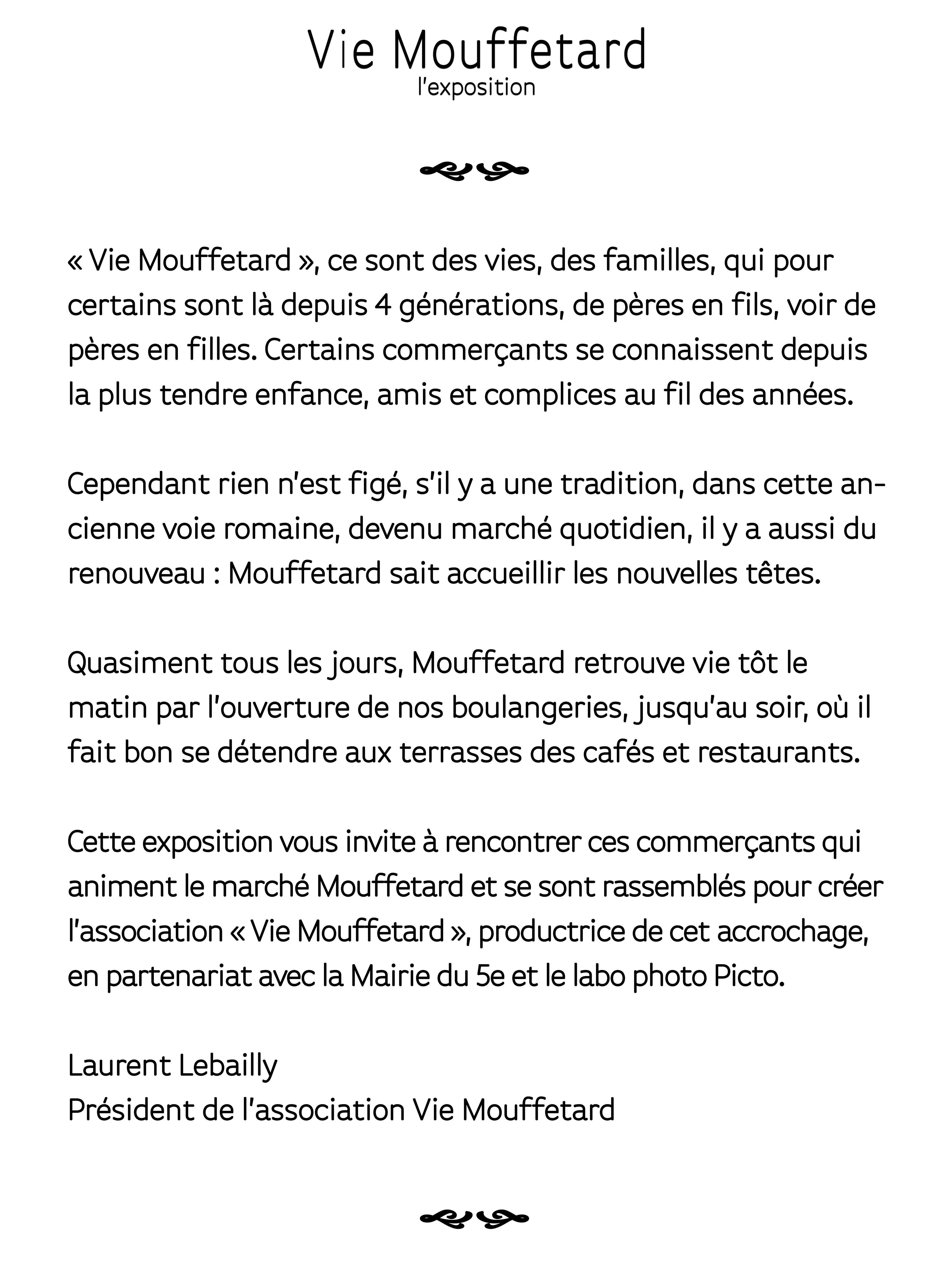 Cette exposition vous invite à rencontrer ces commerçants qui animent le marché Mouffetard et se sont rassemblés pour créer l'association « Vie Mouffetard », productrice de cet accrochage, en partenariat avec la Mairie du 5e et le labo photo Picto.